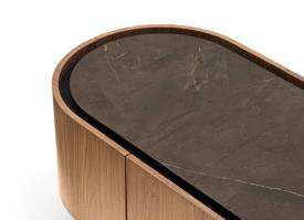 Le buffet LAKE est une proposition pour la zone jour qui se distingue grâce aux lignes douces et harmonieuses . Rehaussé du sol, il présente une forme ovale soulignée par un plateau en céramique légèrement en retrait par rapport au bord, dessinant ainsi entre porte et plateau un espace utile qui pour l’ouverture des portes et des tiroirs. Ce modèle peut être vu à 360° grâce au placage présent sur toute la structure.